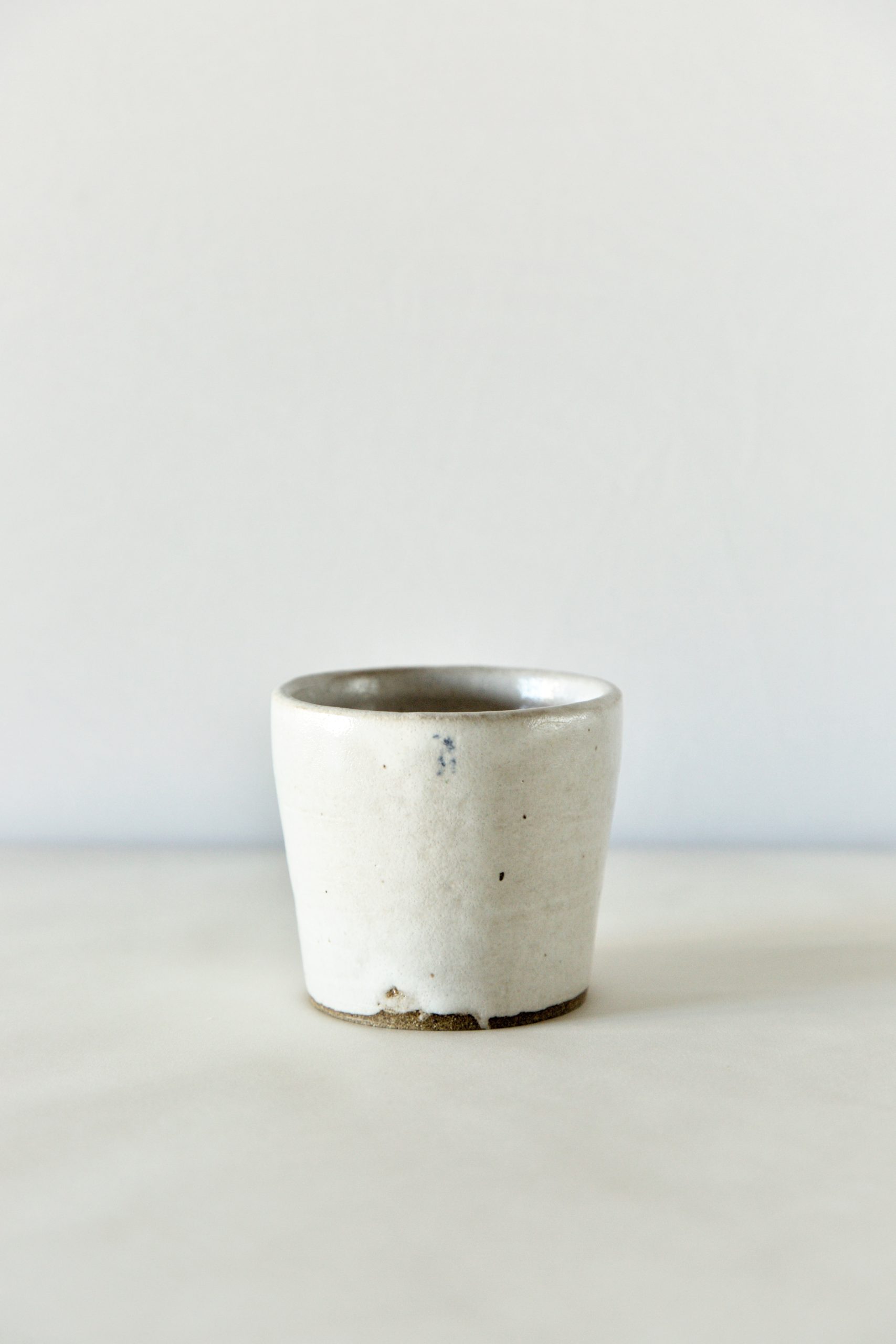 Each cup was wheel thrown with durable stoneware and glazed using white glaze in the interior and exterior. This small cup is a perfect addition to any dinner party or table setting.